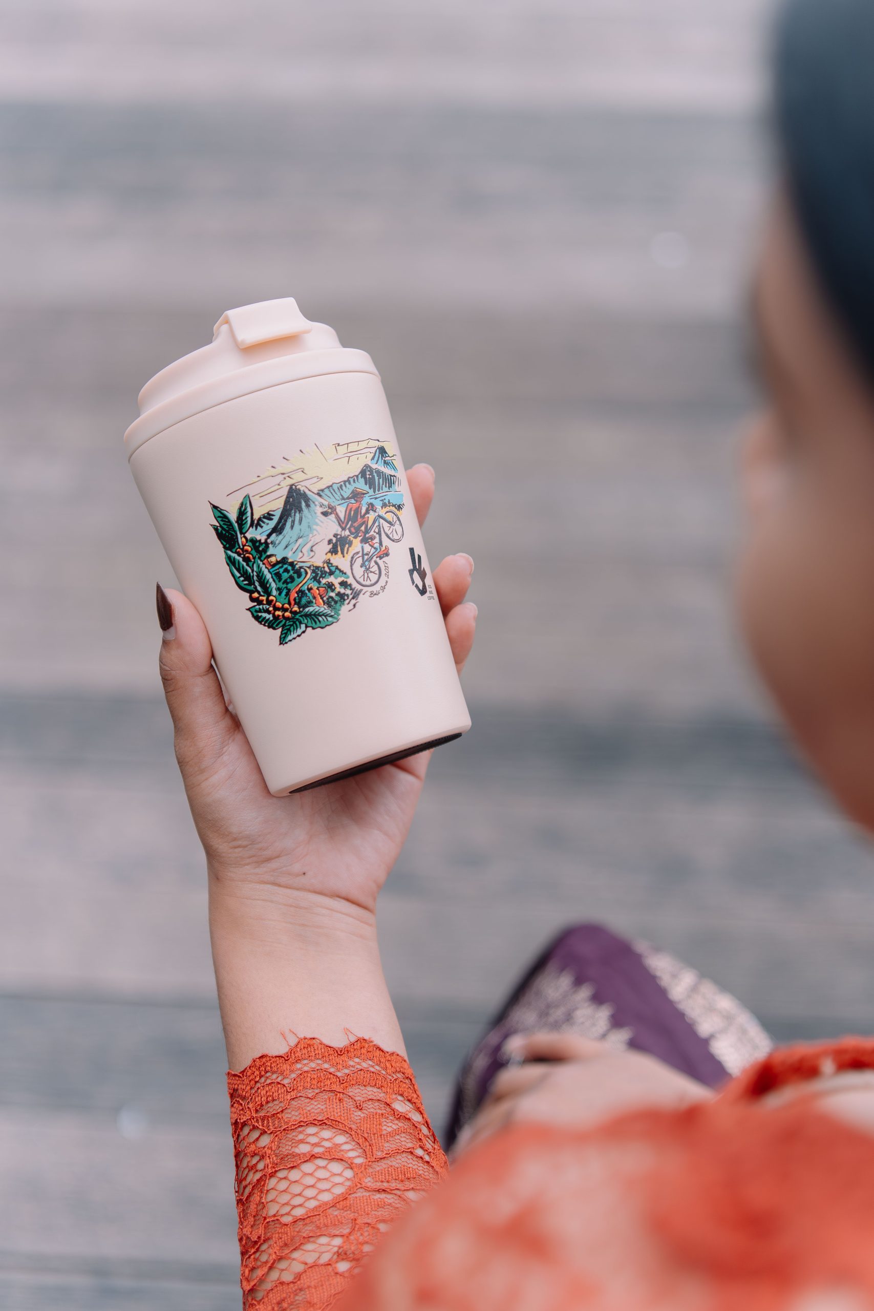 Exclusive Eco Bike Coffee merchandise. A 300 ml insulated stainless steel tumbler in elegant light peach, inspired by the classic takeaway cup design. With double-wall insulation to keep beverages hot or cold longer, it’s compact, reusable, and refined—perfect for coffee lovers who value both sustainability and style.